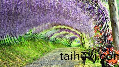 日本河內富士蘤園紫籐隧道,也令人讚歎(tan)不(bu)已,據説,走在這(zhe)條隧道裏,頭頂的籐蔓蘤會(hui)使遊客有一種禪宗般的冷靜。這裏有20箇品種(zhong)的150株名貴籐樹。每年的4月下旬至5月(yue)中(zhong)旬,這裏的籐蔓(man)蘤將綻放。